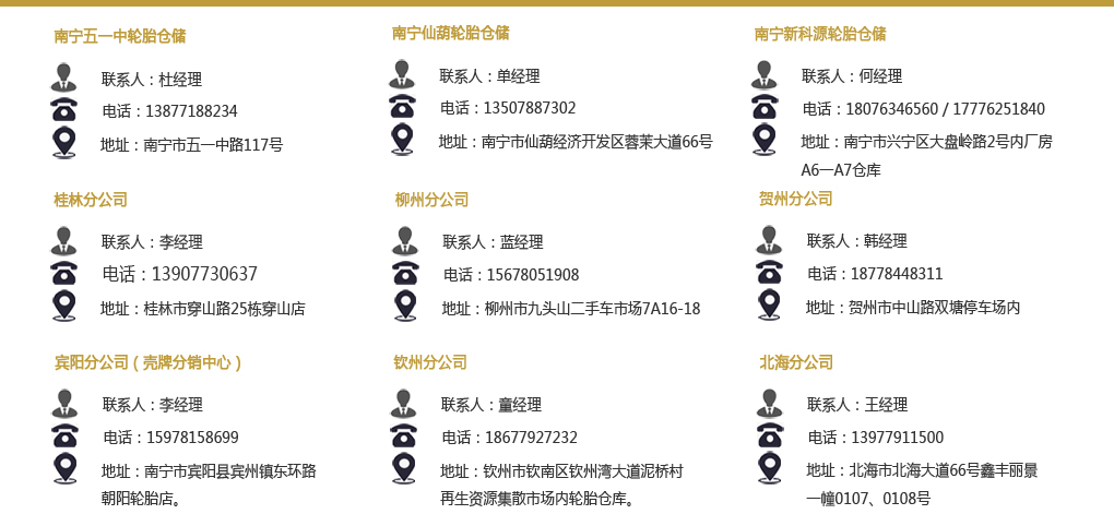 本公司是廣西區(qū)內(nèi)的輪胎批發(fā)及零售商,獨(dú)家代理世界及國(guó)內(nèi)眾多知名品牌輪胎:德國(guó)大陸馬牌輪胎(世界第四品牌),美國(guó)庫(kù)珀輪胎(世界第八品牌)杭州中策朝陽(yáng)(中國(guó)第一品牌),杭州中策好運(yùn)(中國(guó)第二品牌),無(wú)錫紅豆、赤兔馬、千里馬,等品牌。在廣西區(qū)內(nèi)有眾多集團(tuán)客戶,主要為中國(guó)鋁業(yè)股份有限公司平果分公司、廣西晟宇通物流有限公司、南寧市平樂(lè)行物流有限公司、柳州恒達(dá)巴士股份有限公司、廣西欽州國(guó)際集裝箱碼頭有限公司、廣西盛達(dá)混凝土有限公司、火車站物流車隊(duì)、區(qū)內(nèi)部分快運(yùn)車隊(duì)等的輪胎專用供應(yīng)商。多年以來(lái),被南寧市工商局授予“誠(chéng)信?維權(quán)承諾單位”、“消費(fèi)者信得過(guò)單位”以及“南寧市第一次全國(guó)經(jīng)濟(jì)普查先進(jìn)集體單位”。